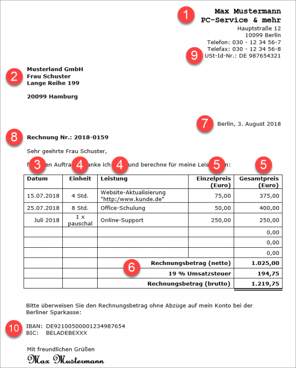 Außerdem gibt die Musterrechnung Ihnen eine mögliche Anordnung und Gestaltung der Rechnung vor.